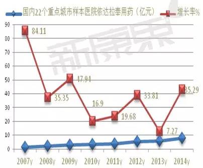 2014年國內(nèi)22個重點(diǎn)城市樣本醫(yī)院腦血管用藥領(lǐng)域中,依達(dá)拉奉注射液用藥已達(dá)到7.65億元的市場規(guī)模,同比上一年增長了35.29%,按照習(xí)慣性測算,國內(nèi)總體市場已超過30億元。