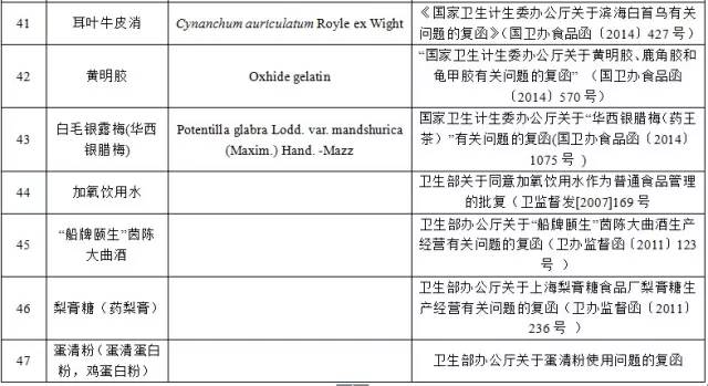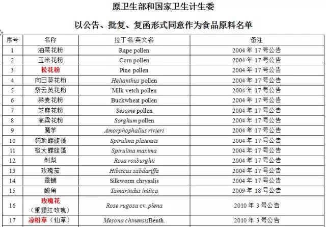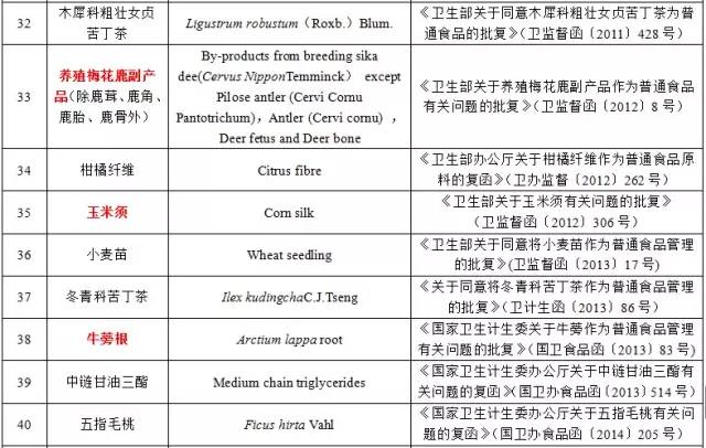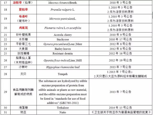 。注:來源于《關(guān)于進(jìn)一步規(guī)范保健食品原料管理的通知》截至2015年10月25日,衛(wèi)計(jì)委以公告、批復(fù)、復(fù)函形式同意作為食品原料的物品共計(jì)47個(gè),其中涉及藥材包括松花粉、牛蒡根、養(yǎng)殖梅花鹿副產(chǎn)品(除鹿茸、鹿角、鹿胎、鹿骨外)、玫瑰花(重瓣紅玫瑰)、酸角、涼粉草(仙草)、夏枯草、布渣葉(破布葉)、雞蛋花、沙棘葉、納豆、粗壯女貞苦丁茶等。