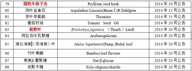 公告批準(zhǔn)的新食品原料共計(jì)88種,其中包括短梗五加、蛹蟲草、金花茶、瑪咖粉、人參(人工種植)、烏藥葉、辣木葉、雪蓮培養(yǎng)物、廣東蟲草子實(shí)體、杜仲雄花、水飛薊籽油、枇杷葉等藥材。