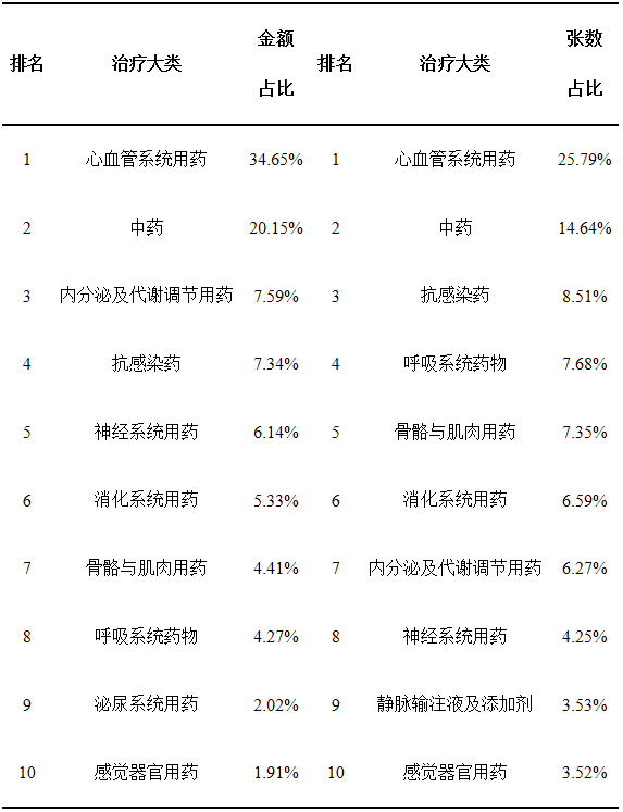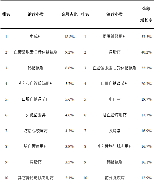 數(shù)據(jù)顯示,金額占比前10的治療小類(lèi)中,中成藥位列首位,市場(chǎng)份額接近20%;屬于心血管系統(tǒng)用藥的有五個(gè)治療小類(lèi),分別是血管緊張素Ⅱ受體拮抗劑、鈣拮抗劑、其它心血管系統(tǒng)用藥、防治心絞痛藥和調(diào)脂藥,前兩個(gè)小類(lèi)用于高血壓治療,合計(jì)市場(chǎng)份額近16%。