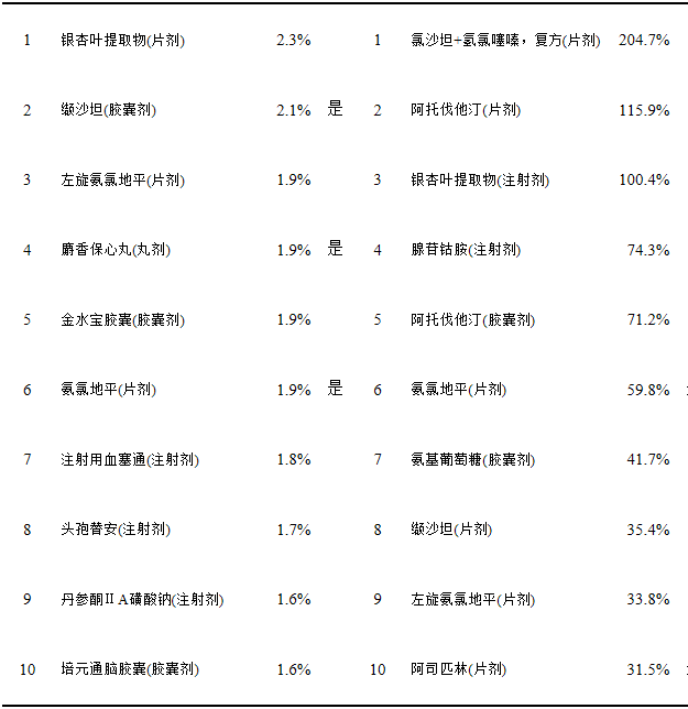 數(shù)據(jù)顯示,金額占比前10的通用名藥物中有5種為心血管系統(tǒng)用藥,分別是纈沙坦、左旋氨氯地平、麝香保心丸、氨氯地平和丹參酮ⅡA磺酸鈉,其中3種為抗高血壓藥,分別系血管緊張素Ⅱ受體拮抗劑和鈣拮抗劑,2種中成藥可用于心絞痛治療。金額增長(zhǎng)率前10的通用名藥物中,屬于心血管系統(tǒng)用藥的高達(dá)7種,分別是氯沙坦+氫氯噻嗪(復(fù)方)、阿托伐他汀兩種(片劑和膠囊劑)、氨氯地平、纈沙坦、左旋氨氯地平和阿斯匹林,其中抗高血壓藥多達(dá)4種。