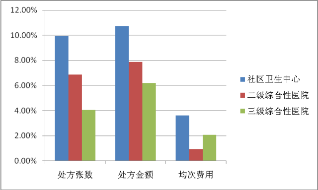 與2012年相比,2013年上海市二、三級(jí)綜合性醫(yī)院及社區(qū)衛(wèi)生中心總體處方張數(shù)、處方金額及均次費(fèi)用均保持繼續(xù)上漲態(tài)勢(shì),但增速各有不同。社區(qū)衛(wèi)生中心無(wú)論是處方張數(shù)、處方金額還是均次費(fèi)用的同比增長(zhǎng)率均顯著高于二、三級(jí)綜合性醫(yī)院,尤其處方金額更是達(dá)到了兩位數(shù)的增長(zhǎng)(圖1)。