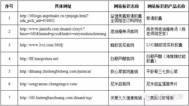 近期,國家藥監(jiān)總局監(jiān)督檢查發(fā)現(xiàn),標(biāo)識為“益健美嘉紫清膠囊全國指定訂購網(wǎng)”“泄油瘦身湯官網(wǎng)”“蜂膠苦瓜官網(wǎng)”“白藜蘆醇官網(wǎng)”“救心菜官網(wǎng)直銷”“尼米茲官網(wǎng)”“關(guān)愛久久健康商城”的7家互聯(lián)網(wǎng)站違法發(fā)布虛假信息,內(nèi)容含有不科學(xué)地宣稱治療疾病功效的斷言,以及利用學(xué)術(shù)機構(gòu)、專家、醫(yī)生、患者等名義形象作證明等問題,欺騙誤導(dǎo)消費者,嚴(yán)重危害公眾飲食用藥安全。