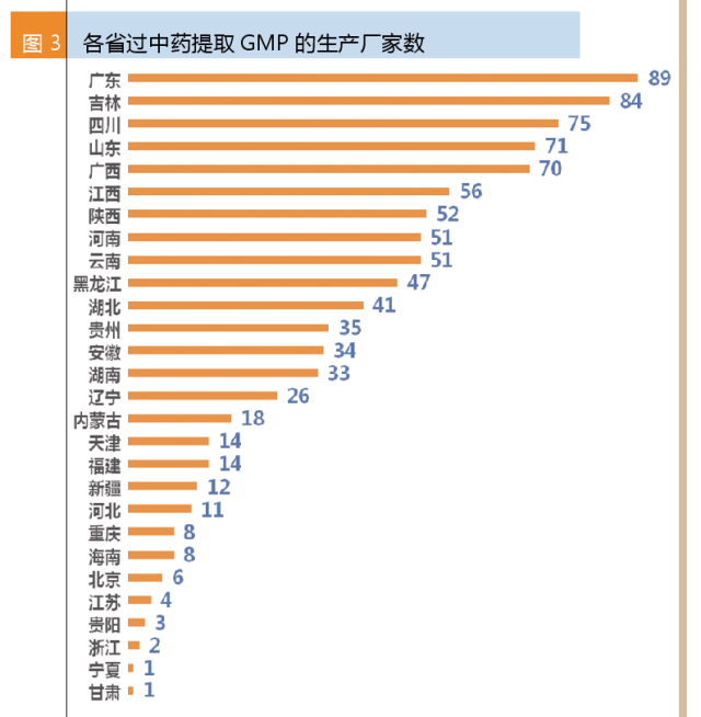各省過(guò)中藥提取的GMP數(shù)據(jù)中:廣東廠家數(shù)最多,共89家;其次是吉林,共84家;四川、山東和廣西的廠家數(shù)都過(guò)70家。值得注意的是,華東過(guò)中藥提取GMP的廠家數(shù)并不多,浙江才2家,江蘇4家,上海0家。