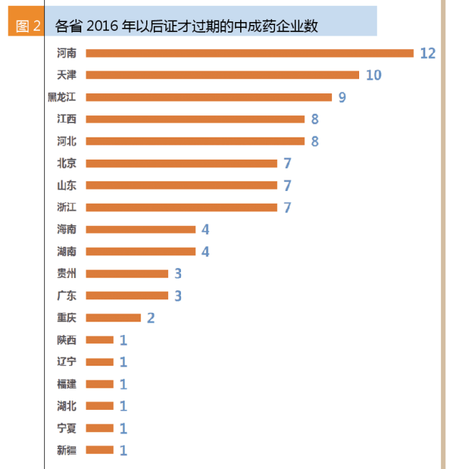 2016~2019年才過(guò)期的90家中成藥生產(chǎn)企業(yè)中,河南的企業(yè)最多,共12家;其次是天津,共10家;第三是黑龍江。一些中藥企業(yè)較多的省份都是2015年到期,如吉林、廣西和四川。即使是有著中成藥傳統(tǒng)的廣東,2016年后才過(guò)期的只有3家。