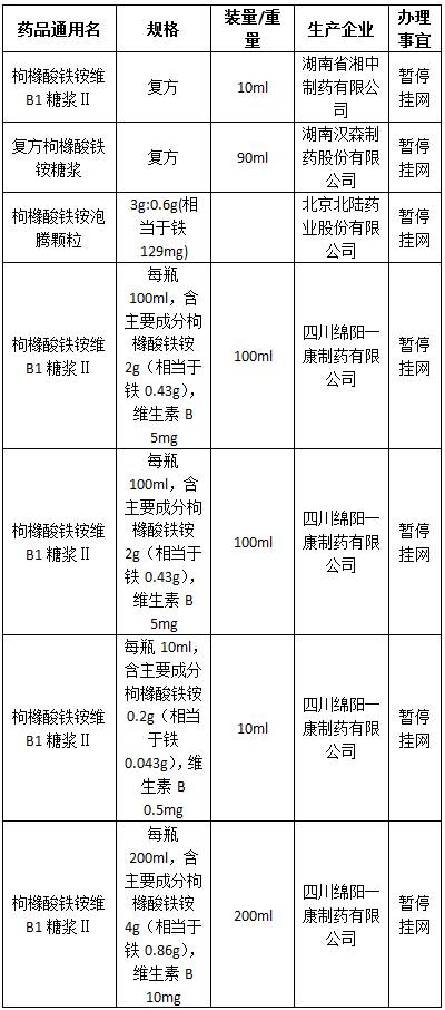 為保障公眾用藥安全,按上級部門指示,對四川省掛網(wǎng)的涉及使用不合格原料生產(chǎn)的湖南省湘中制藥有限公司等7家生產(chǎn)企業(yè)的枸櫞酸鐵銨維B1糖漿Ⅱ(復方*12支)等14個品規(guī)暫停掛網(wǎng)銷售,全省上網(wǎng)采購醫(yī)療機構(gòu)立即停止銷售和使用以上藥品。