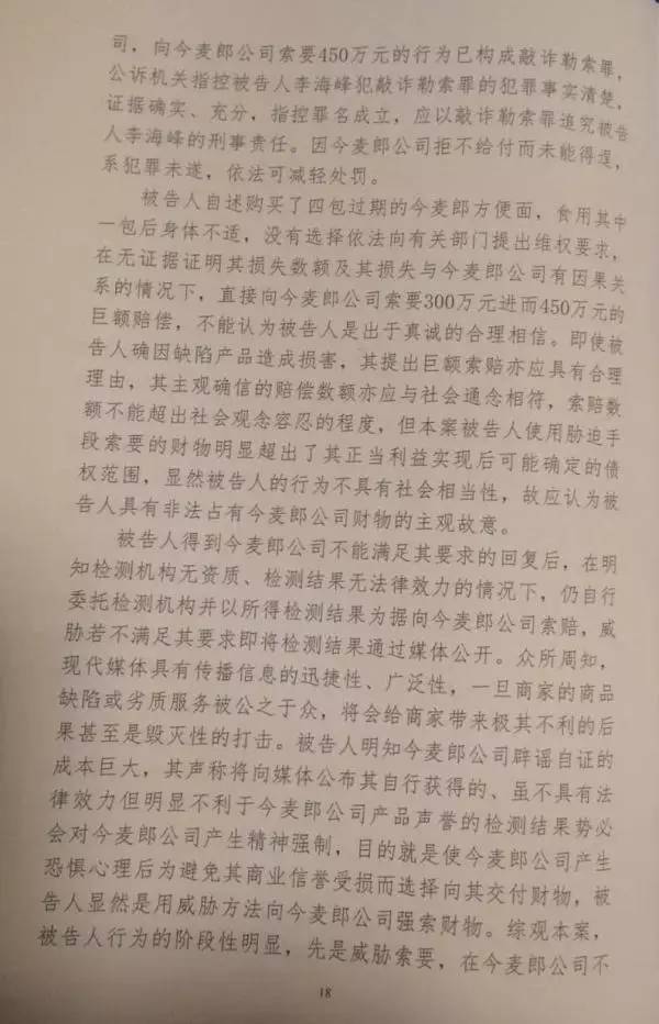 法院判決認定,李海峰在食用一包今麥郎方便面后身體不適,向今麥郎公司索要450萬元的巨額賠償,超出了社會觀念容忍的程度,明顯超出其正當利益實現(xiàn)后可能確定的債權(quán)范圍,具有非法占有今麥郎公司財物的主觀故意。