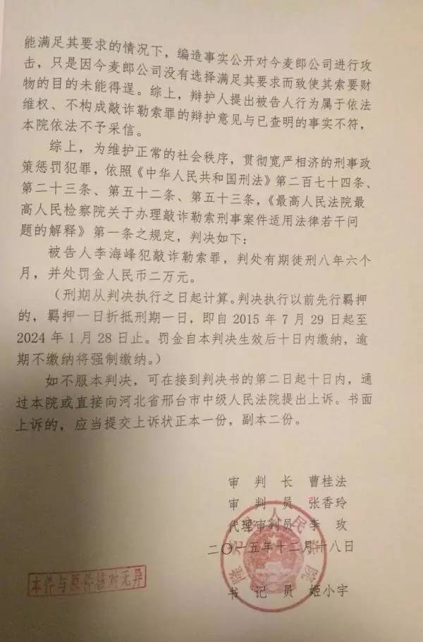 河北隆堯縣法院一審以敲詐勒索罪判處李海峰有期徒刑八年六個月,并處罰金2萬元。
