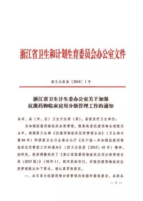 浙江省衛(wèi)生計生委辦公室關(guān)于加強(qiáng)抗菌藥物臨床應(yīng)用分級管工作工作通知-浙衛(wèi)辦醫(yī)政[2016]1號文件