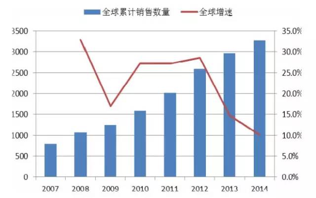 截止2014年,直覺外科公司已經(jīng)銷售達芬奇手術(shù)機器人系統(tǒng)3266臺,其中美國2223臺,歐洲549臺,日本191,其它地區(qū)301臺。累計銷量自2008年超過1000臺以來,連續(xù)幾年均保持高速增長,但是從2013年開始增速放緩,2013年達芬奇機器人全球裝機量達2966臺,2014年達3266臺,增速10.1%。