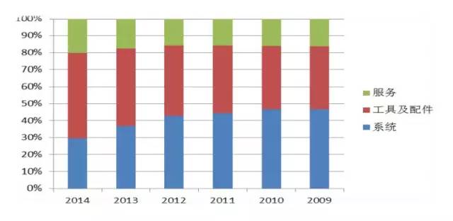 2012年工具配件服務(wù)等經(jīng)常性收入的占比只有57%,而到2014年這一比率已經(jīng)增加到了70%。經(jīng)常性收入指的是工具、配件等耗材收入以及維保、培訓(xùn)等服務(wù)收入。