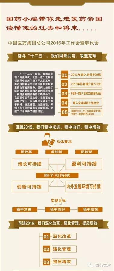 “十二五”期間,國(guó)藥集團(tuán)迅速做大做強(qiáng),始終保持國(guó)內(nèi)行業(yè)第一,于2013年進(jìn)入世界500強(qiáng),2015年排名提升至276位。是中國(guó)第一家進(jìn)入世界500強(qiáng)的醫(yī)藥企業(yè),提前兩年實(shí)現(xiàn)戰(zhàn)略目標(biāo),跨入全球制藥十強(qiáng)企業(yè),全球行業(yè)地位和企業(yè)影響力不斷提升。