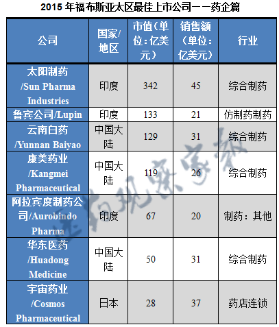 近日,福布斯中文網(wǎng)再次發(fā)布榜單——《2015年福布斯亞太區(qū)最佳上市公司50強》。瀏覽整個榜單,上榜的藥企共有7家,中國有華東醫(yī)藥、康美藥業(yè)、云南白藥等3家藥企上榜,印度2家,日本1家。