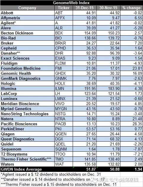 無獨有偶,美國股市也不例外,根據(jù)GenomeWeb的數(shù)據(jù)統(tǒng)計顯示,2015年的最后一個月瓊斯工業(yè)平均指數(shù)和納斯達克指數(shù)平均下跌2%,但是納斯達克生物科技指數(shù)卻上漲了1%。再仔細看下主要的一些生物科技相關(guān)上市公司的情況,會發(fā)現(xiàn)基因測序和基因診斷相關(guān)企業(yè)成為了生物技術(shù)板塊增長的主力軍,包括測序儀巨頭Illumina、Pacific Biosciences、Thermo Fisher Scientific ,以及基因診斷行業(yè)相關(guān)公司Foundation Medicine 、Natera和Genomic health,而其它一些大部分企業(yè)股票顯示下跌。
