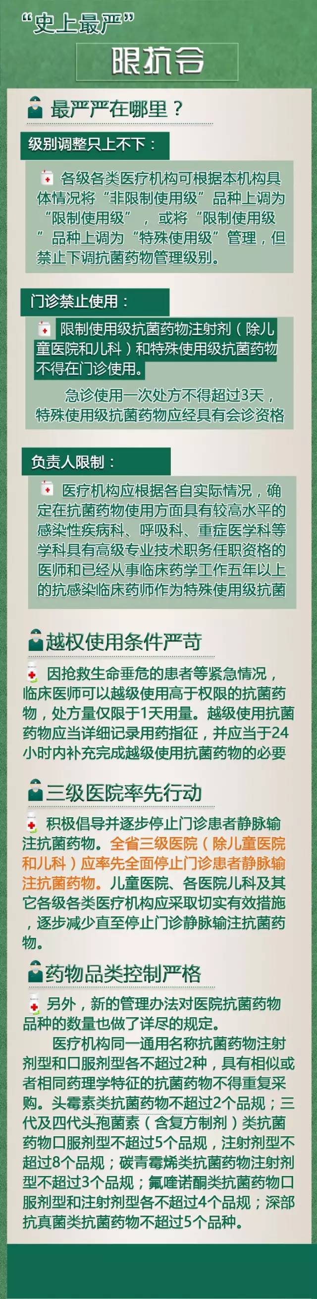 被稱為“史上最嚴限抗令”的抗菌藥物臨床應用分級管理,對藥品使用級別調整、門診使用情況、越權使用情況都做了詳盡的規(guī)定。