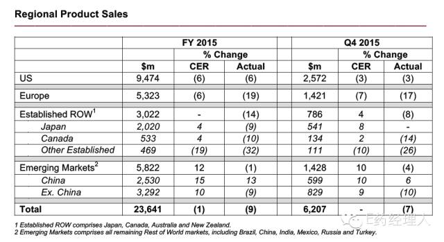 阿斯利康日前發(fā)布的年報業(yè)績公告顯示:阿斯利康全球2015年銷售額較上年基本持平,其中新興市場的增長是重要亮點之一,阿斯利康中國2015年銷售額達到25.3億美元,折合人民幣約為164.77億元,占全球總銷售額236.41美元的10.7%,同比增長15%。是僅次于美國以外的第二大市場,超過了日本。