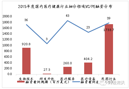從細(xì)分領(lǐng)域上看,醫(yī)藥行業(yè)2015年度融資規(guī)模領(lǐng)先,融資金額為17.34億美元,案例數(shù)量為39起;生物技術(shù)2015年度的融資金額規(guī)模略遜,融資金額為9.21億美元,案例數(shù)量為36起;醫(yī)療設(shè)備融資金額為4.04億美元,案例數(shù)量為23起,略遜于生物技術(shù)行業(yè);而醫(yī)療服務(wù)類雖然融資金額較低,僅為2.60億美元,但由于2015年上半年互聯(lián)網(wǎng)醫(yī)療行業(yè)的火熱,案列數(shù)量最高,達(dá)43起;研發(fā)外包類融資金額2730萬美元,案列數(shù)量為3起。