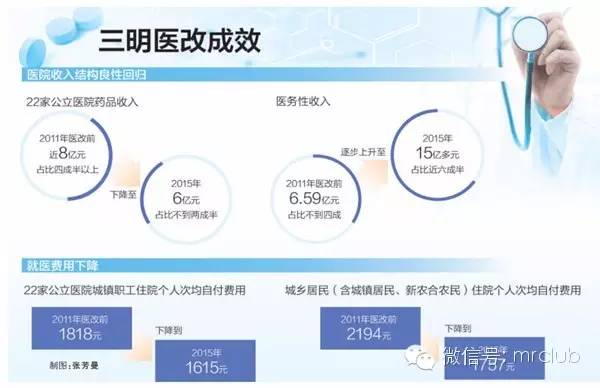將樂(lè)縣醫(yī)院收入結(jié)構(gòu)的變化,也是三明市22家公立醫(yī)院的一個(gè)縮影。22家公立醫(yī)院藥品收入由2011年醫(yī)改前的近8億元、占比四成半以上,下降至2015年的6億元、占比不到兩成半;醫(yī)務(wù)性收入則由6.59億元、占比不到四成,逐步上升至2015年的15億多元、占比近六成半。