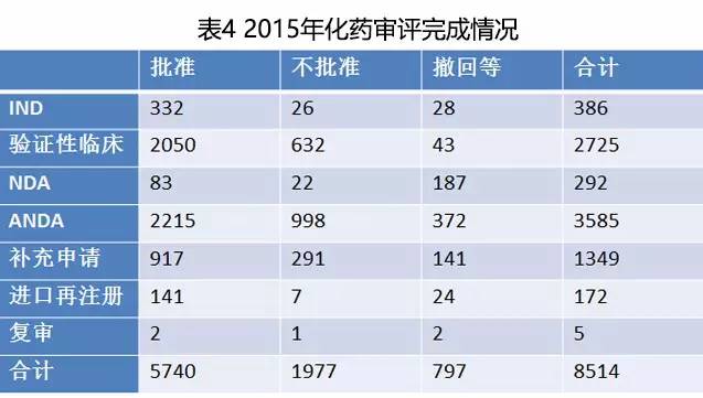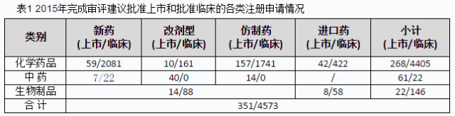 2015年完成審評建議批準上市和批準臨床的情況見表1(不包括補充申請和進口再注冊)。