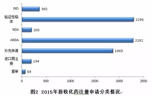 2015年,新接收化藥注冊申請共7270個。其中驗證性臨床、ANDA、補充申請三類注冊申請占化藥全年接收量的88.6%。