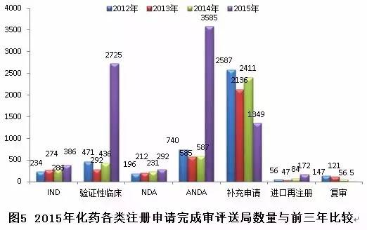 2015年,藥審中心全年完成審評的注冊申請共9601個,超過年度接收量1390個,實現(xiàn)了完成量大于接收量。其中建議批準臨床4676個,建議批準上市391個,建議批準補充申請1183個,建議批準進口再注冊143個,建議各類不批準2208個,另有企業(yè)撤回等情況的注冊申請1000個。