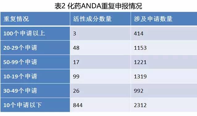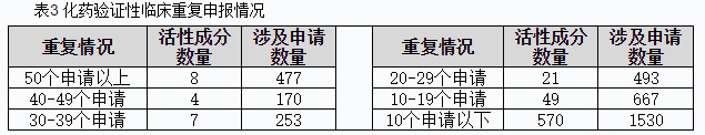 截至2015年底,待審的化藥驗證性臨床申請共3590個,占待審任務(wù)總量的20.8%,涉及活性成分660個。重復(fù)申報較嚴重的有40個活性成分(待審任務(wù)量均在20個受理號以上),涉及注冊申請1393個,占化藥驗證性臨床總?cè)蝿?wù)量的38.8%。其中相同活性成分待審任務(wù)超過50個的有沃替西汀、阿普斯特、阿考替胺、曲格列汀、阿伐那非、阿法替尼、阿齊沙坦、卡格列凈。