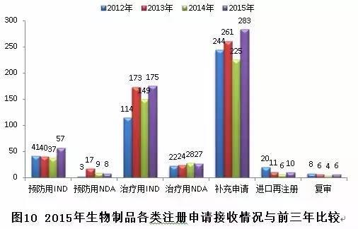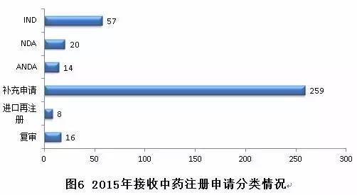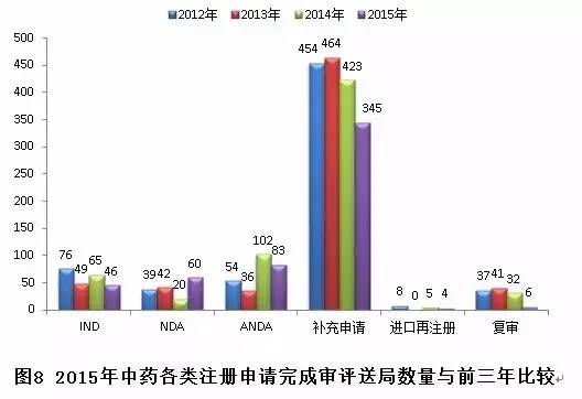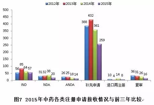 2015年,新接收中藥注冊申請共374個,各類注冊申請接收情況與前三年比較見下圖:
