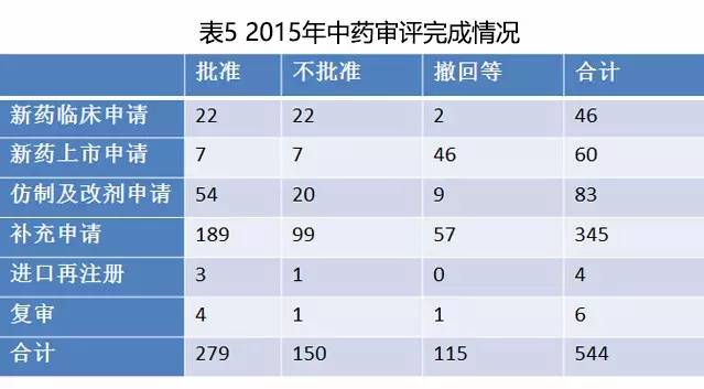 2015年中心完成中藥審評544個,具體情況見下表。其中批準的仿制及改劑型均為遺留品種。