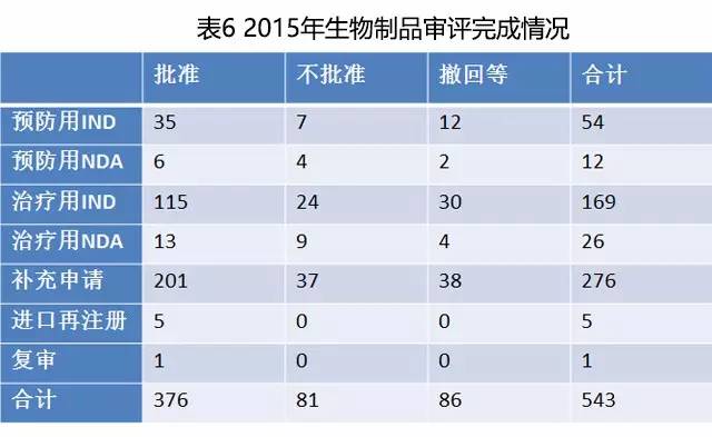 2015年中心完成生物制品審評543個,具體情況見下表。