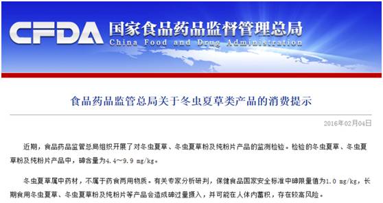 近日,國家食藥監(jiān)總局發(fā)布的“冬蟲夏草砷超標”這一條消息被傳得沸沸揚揚,多家媒體均發(fā)表系列主題文章,提示大家將冬蟲夏草藥食兩用或有風(fēng)險。更有媒體為博人眼球而把冬蟲夏草與砒霜相比較,令服用冬蟲夏草的患者和以之作為保健品食用的人群出了一身冷汗。