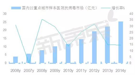 數(shù)據(jù)顯示,2014年國內(nèi)22重點城市樣本醫(yī)院抗病毒市場達到了25.60億元,同比上一年增長了14.73%。其中抗肝炎病毒治療藥物占據(jù)了83.34%,抗流感病毒治療藥物、抗AIDS病毒藥物和其它抗病毒藥物占據(jù)了16.66%。但仔細分析可以發(fā)現(xiàn),抗肝炎病毒治療藥物同比上一年增長率為14.53%,其它抗病毒治療藥物同比上一年增長率為8.46%,由于抗免疫缺陷病毒藥物多不從樣本醫(yī)院渠道進入終端市場,所以抗AIDS病毒藥物為負增長。