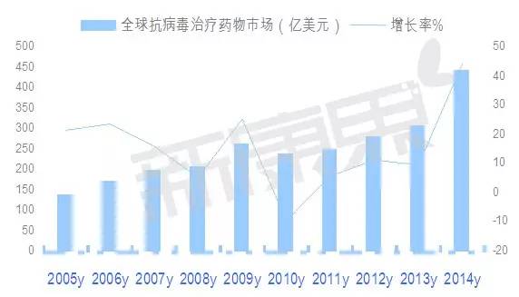 2014年全球七大藥品市場抗病毒藥物市場規(guī)模達445.07億美元,比上一年增長了44.48%。該統(tǒng)計數(shù)據(jù)囊括了40多個藥物,葛蘭素史克、吉利德、百時美施貴寶、默沙東、羅氏、強生成為全球抗病毒藥物六大主力生產(chǎn)銷售商,其重點品種集中在抗丙肝病毒、抗乙肝病毒和抗免疫缺陷病毒領(lǐng)域,而廣譜抗病毒新藥開發(fā)進程緩慢。