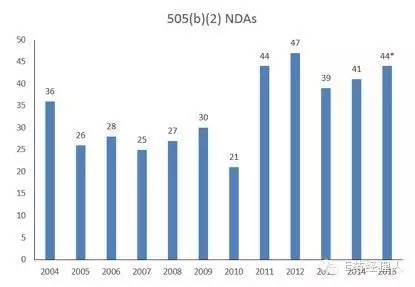 在美國,2014年FDA按照505(b)(2)途徑批準(zhǔn)了41個(gè)藥物,2015年保持強(qiáng)勁勢頭,44個(gè)藥物得到批準(zhǔn)。下圖為2004-2015年按照505(b)(2)途徑批準(zhǔn)藥物情況。