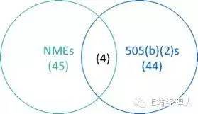 2015年FDA新藥批準(zhǔn)數(shù)量有很大提升,共有45個(gè)新藥獲得批準(zhǔn),而按照505(b)(2)途徑批準(zhǔn)的藥物數(shù)量與新藥批準(zhǔn)的數(shù)量基本相當(dāng)。在45個(gè)新藥中,有4個(gè)是通過505(b)(2)途徑批準(zhǔn)的,如下圖所示。