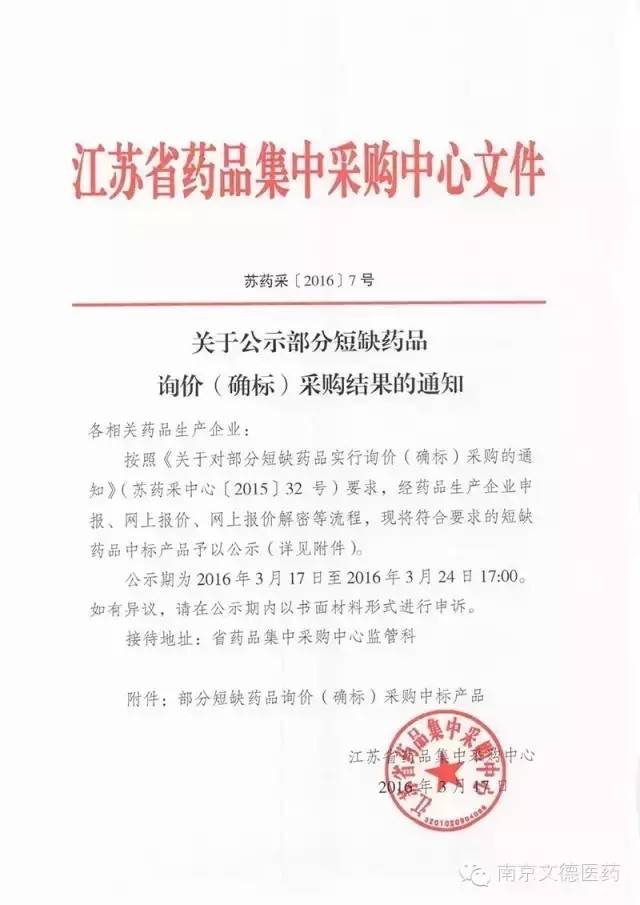 江蘇省藥品集中采購中心關(guān)于公示部分短缺藥品詢價(確標(biāo))采購結(jié)果的通知