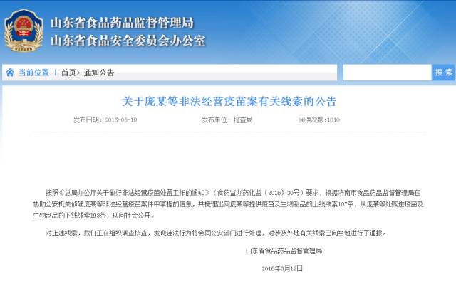 3月19日晚,山東省食藥監(jiān)局對此案作出回應稱,經過梳理發(fā)現,向龐某等提供疫苗及生物制品的上線線索107條,從龐某等處購進疫苗及生物制品的下線線索193條,涉及全國24省市,另外還有300名買賣疫苗的人員名單。
