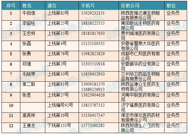 山東省藥監(jiān)局3月19日發(fā)布的《關(guān)于龐某等非法經(jīng)營疫苗案有關(guān)線索的公告》,曝光了上線人員107條,下線人員193條。總局初步確認了其中12人的身份,分別為12家藥企的業(yè)務(wù)員。具體如下所示: