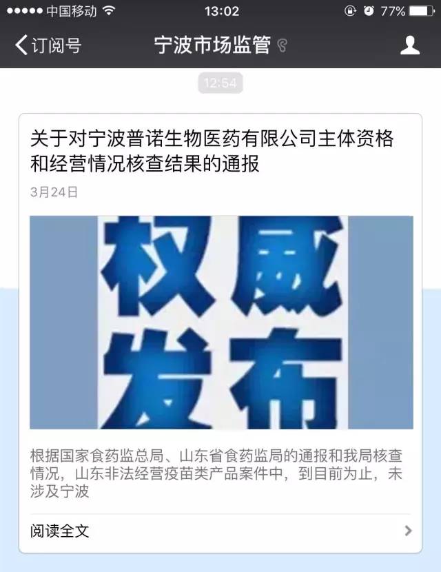 根據(jù)國家食藥監(jiān)總局、山東省食藥監(jiān)局的通報和我局核查情況,山東非法經(jīng)營疫苗類產(chǎn)品案件中,到目前為止,未涉及寧波企業(yè)。針對網(wǎng)絡(luò)輿情中反映的寧波普諾生物醫(yī)藥有限公司,寧波市市場監(jiān)督管理局已經(jīng)著手對其主體資格和經(jīng)營情況進(jìn)行調(diào)查,現(xiàn)將有關(guān)核查情況通報如下: