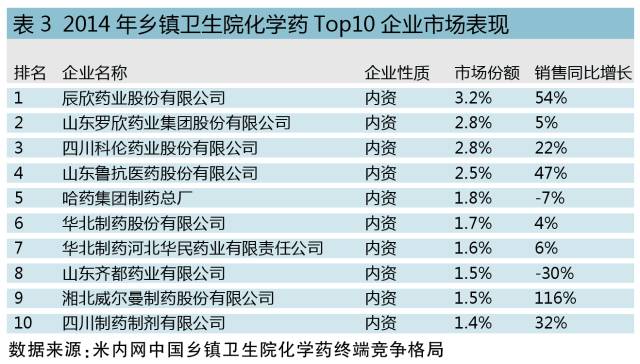 從廠家角度看,農(nóng)村基層目前仍舊是內(nèi)資企業(yè)的天下,外資企業(yè)鞭長莫及。農(nóng)村基層醫(yī)療機(jī)構(gòu)用藥Top 10企業(yè)基本上都是抗菌素生產(chǎn)廠家。其中,湘北威爾曼制藥股份有限公司的產(chǎn)品銷售增長翻倍,辰欣藥業(yè)股份有限公司也有超過50%的銷售增長,從這些快速增長企業(yè)的主打產(chǎn)品可以一窺未來鄉(xiāng)鎮(zhèn)衛(wèi)生院藥物市場的變化趨勢。