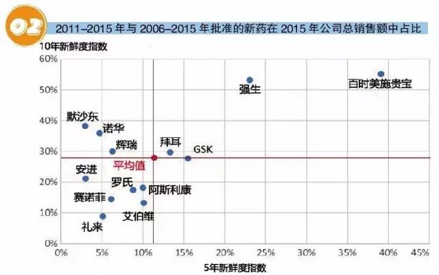 ● 僅有強生、百時美施貴寶和葛蘭素史克(GlaxoSmithKline)3家藥企銷售額和新鮮度指數(shù)超過13家藥企的平均水平,有8家藥企兩項指標均落后于平均水平。