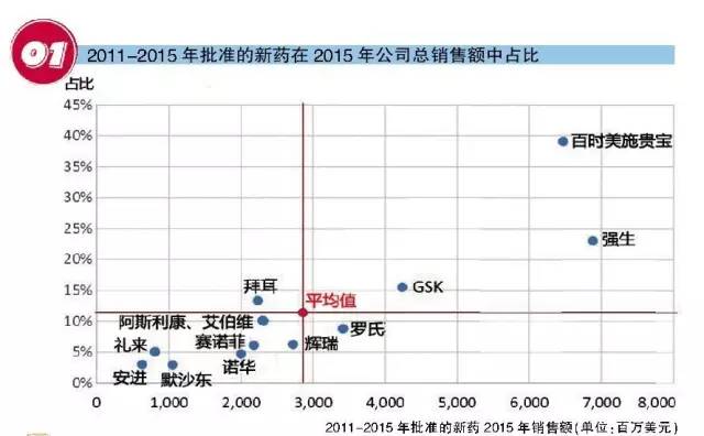● 13家藥企的平均銷售水平難以確定?;A(chǔ)數(shù)據(jù)顯示,這些藥企每年研發(fā)支出總計約為750億美元,但2011年至今獲批的77個新分子實體在2015年僅帶來370億美元的銷售額,占其總銷售額的11%。若除去強生和百時美施貴寶,剩下的11家藥企每年花費640億美元在研發(fā)工作上,2011年至今獲批的62個新分子實體2015年僅收獲240億美元,研發(fā)回報率均不高。