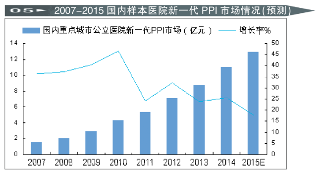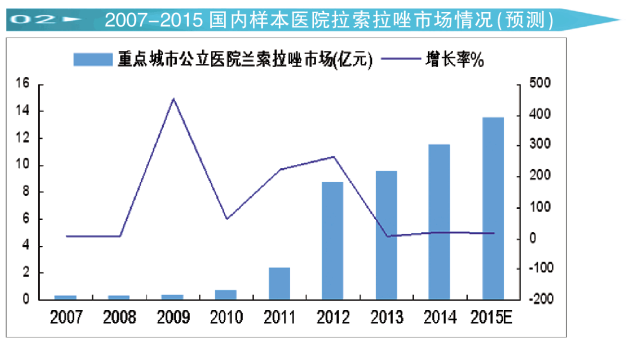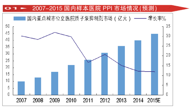 據(jù)HDM系統(tǒng)數(shù)據(jù),艾普拉唑在國內(nèi)重點城市公立醫(yī)院抗酸及潰瘍市場中一路高走,2010年排名第29位,2012年進入第16位,2014年同比上一年增長82.43%,并快速進入第9位,預測2015年將進入第7位。另據(jù)IMS醫(yī)院用藥數(shù)據(jù),自上市以來艾普拉唑每年銷售收入復合增長率達65%以上,預計2015年全年銷售額約2億元。