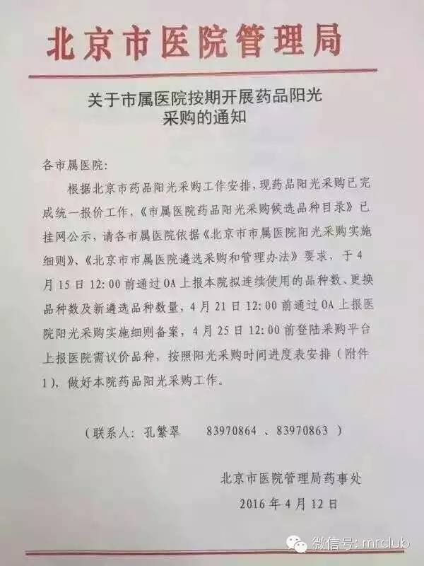 上述文件為北京市醫(yī)院管理局昨日的通知,據(jù)MRCLUB網(wǎng)友提供另一份北京市醫(yī)院管理局今日再發(fā)的一份通知顯示,要求各醫(yī)院須于本月15日12:00前通過OA上報本院擬連續(xù)使用的品種數(shù)、更換品種數(shù)及新遴選品種數(shù)量,4月21日12:00前通過OA上報醫(yī)院陽光采購實施細則備案,4月25日12:00前登陸采購平臺上報醫(yī)院需議價品種,按照陽光采購進度表安排,做好本院藥品陽光采購工作。