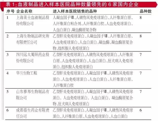 據(jù)CFDA數(shù)據(jù),目前國(guó)內(nèi)擁有血液制品生產(chǎn)許可范圍的企業(yè)共28家,其中7家企業(yè)有6個(gè)(含6個(gè))以上品種進(jìn)入樣本醫(yī)院銷售,包括上海萊士血液制品股份有限公司(8個(gè))、上海生物制品研究所有限責(zé)任公司(8個(gè))、四川遠(yuǎn)大蜀陽(yáng)藥業(yè)股份有限公司(7個(gè))、華蘭生物工程(7個(gè))、山東泰邦生物制品有限公司(7個(gè))、成都蓉生藥業(yè)有限責(zé)任公司(6個(gè))。(見表1)