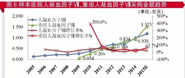 2005-2015年,樣本醫(yī)院人凝血因子Ⅷ和重組人凝血因子Ⅷ采購(gòu)金額趨勢(shì)圖顯示(見圖6),2012-2015年3年間樣本醫(yī)院人凝血因子Ⅷ和重組人凝血因子Ⅷ采購(gòu)金額年復(fù)合增長(zhǎng)率分別為19.9%和37.4%。