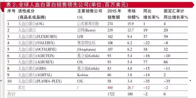 據(jù)統(tǒng)計(jì),2014年10月至2015年9月,按制劑出廠金額計(jì),全球人血白蛋白市場(chǎng)規(guī)模約為17億美元,中國(guó)人血白蛋白市場(chǎng)規(guī)模為5.7億美元,同比增長(zhǎng)12%,是全球人血白蛋白市場(chǎng)規(guī)模最大的國(guó)家;美國(guó)居第二位,達(dá)2.7億美元,同比增長(zhǎng)6%。全球人血白蛋白銷售領(lǐng)先公司見表2??上驳氖牵?/span>山東泰邦生物制品有限公司在全球人血白蛋白銷售領(lǐng)先公司之列,并居第二位。