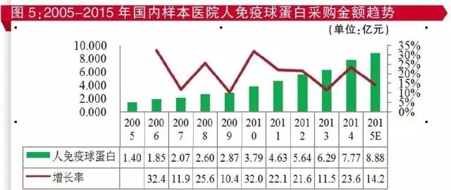 從2005-2015年樣本醫(yī)院人免疫球蛋白采購(gòu)金額趨勢(shì)(見圖5)看出,2012-2015年3年間樣本醫(yī)院人免疫球蛋白采購(gòu)金額年復(fù)合增長(zhǎng)率為16.3%。