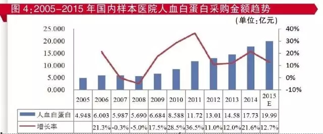 據(jù)PDB數(shù)據(jù),預(yù)計(jì)2015年樣本醫(yī)院人血白蛋白采購(gòu)金額合計(jì)約為20億元,占血液制品采購(gòu)金額的57%,比例日趨合理(2005年占比為66.4%)。從樣本醫(yī)院2005-2015年人血白蛋白采購(gòu)金額趨勢(shì)圖中看出(見圖4),2012-2015年3年間樣本醫(yī)院人血白蛋白采購(gòu)金額年復(fù)合增長(zhǎng)率為15.4%。