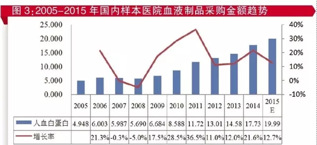 據(jù)PDB數(shù)據(jù),預(yù)計(jì)2015年樣本醫(yī)院血液制品采購(gòu)金額合計(jì)約35億元,2005-2015年樣本醫(yī)院血液制品采購(gòu)金額趨勢(shì)見圖3,10年間年復(fù)合增長(zhǎng)率為16.7%。