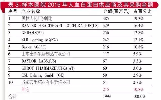 據(jù)PDB數(shù)據(jù),2015年樣本醫(yī)院人血白蛋白供應(yīng)商有32家,前10家采購(gòu)金額及其所占份額見表3。